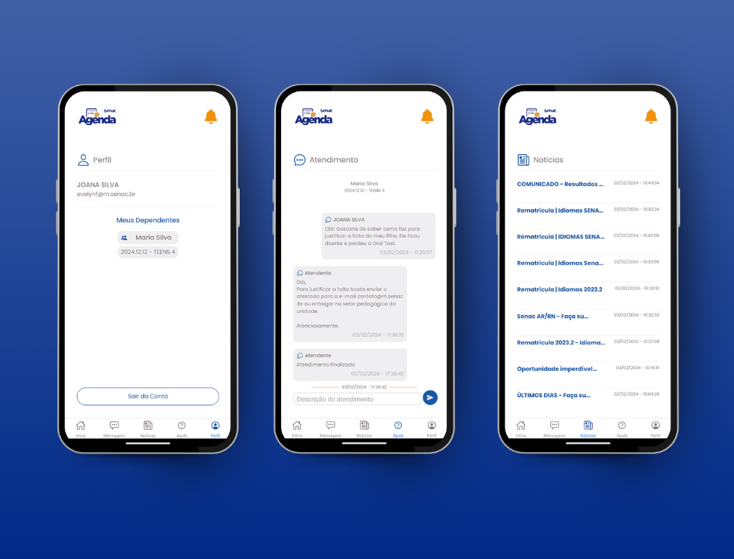 O aplicativo Agenda Senac RN tem o objetivo de fornecer um canal de comunicação entre a instituição, alunos e responsáveis de alunos ativos em cursos do Senac RN. No aplicativo é possível ter acesso a mensagens, notícias e a realização de atendimentos relacionados aos alunos e suas respectivas turmas em cursos do Senac RN. O acompanhamento pedagógico em um só lugar!