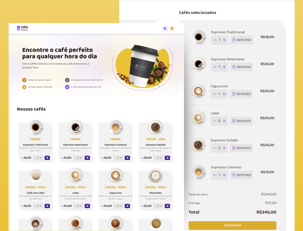 O sistema consiste em selecionar cafés, definindo a quantidade de cada produto, e gerar uma comanda com informações do carrinho, endereço e método de pagamento.