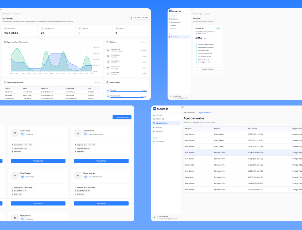 Plataforma web de agendamentos para clínicas, sendo possível conferir a saúde financeira da clínica através de gráficos informativos, cadastrar e listar médicos, pacientes e agendamentos